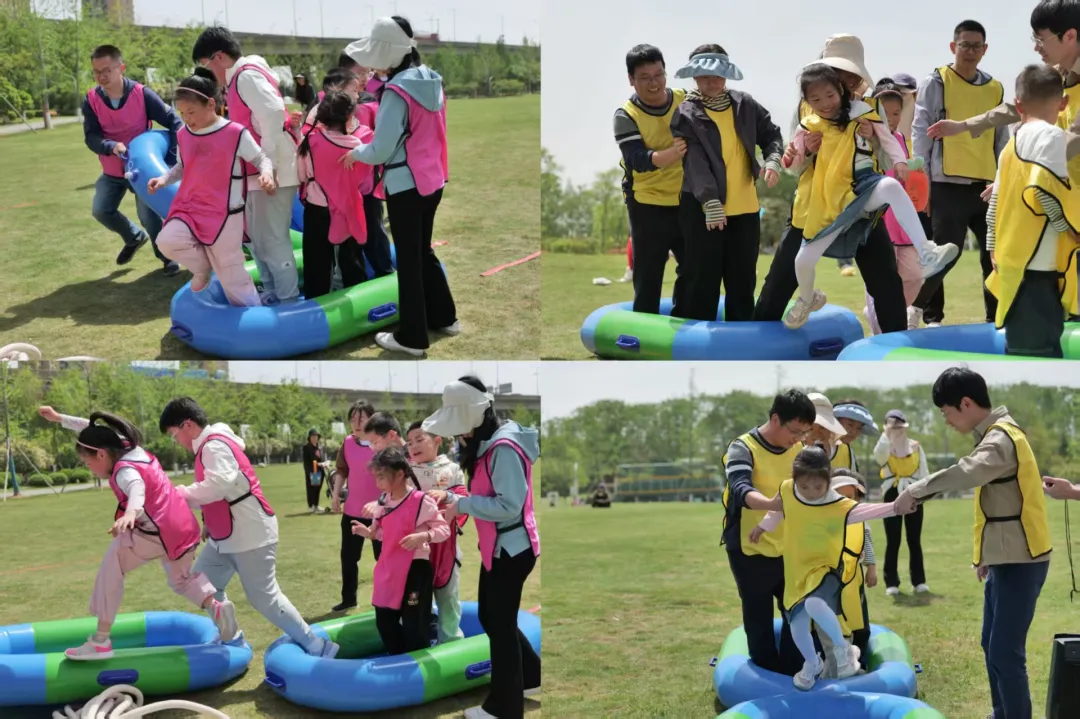 展现了竞技小队的智慧与协作。利用登陆艇作为"踏脚石",父母与萌娃需要相互配合、稳步前行才能成功"登陆"。有的小组采取稳健策略,有的小组则大胆尝试快速通过,各具特色的表现方式为比赛增添了趣味性。
